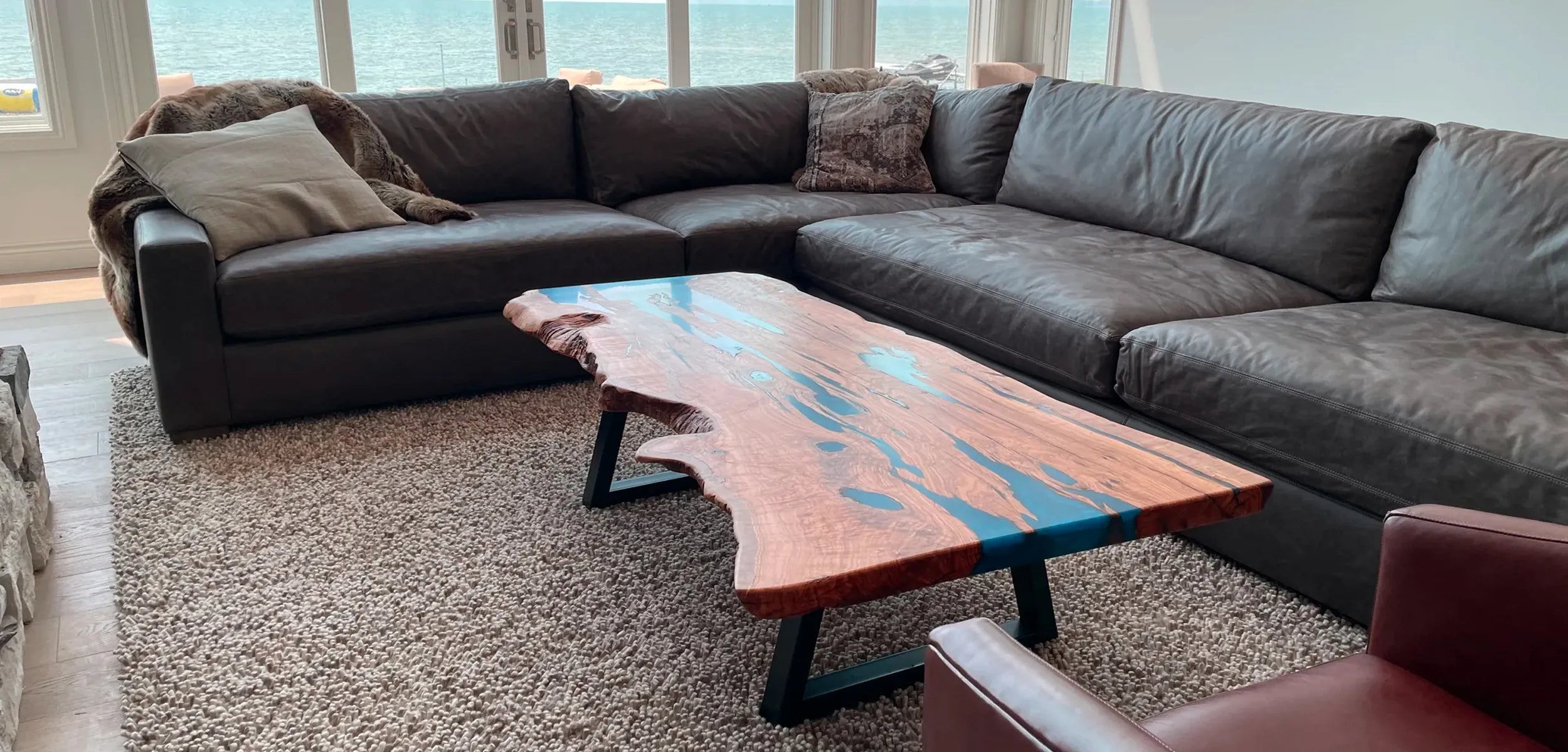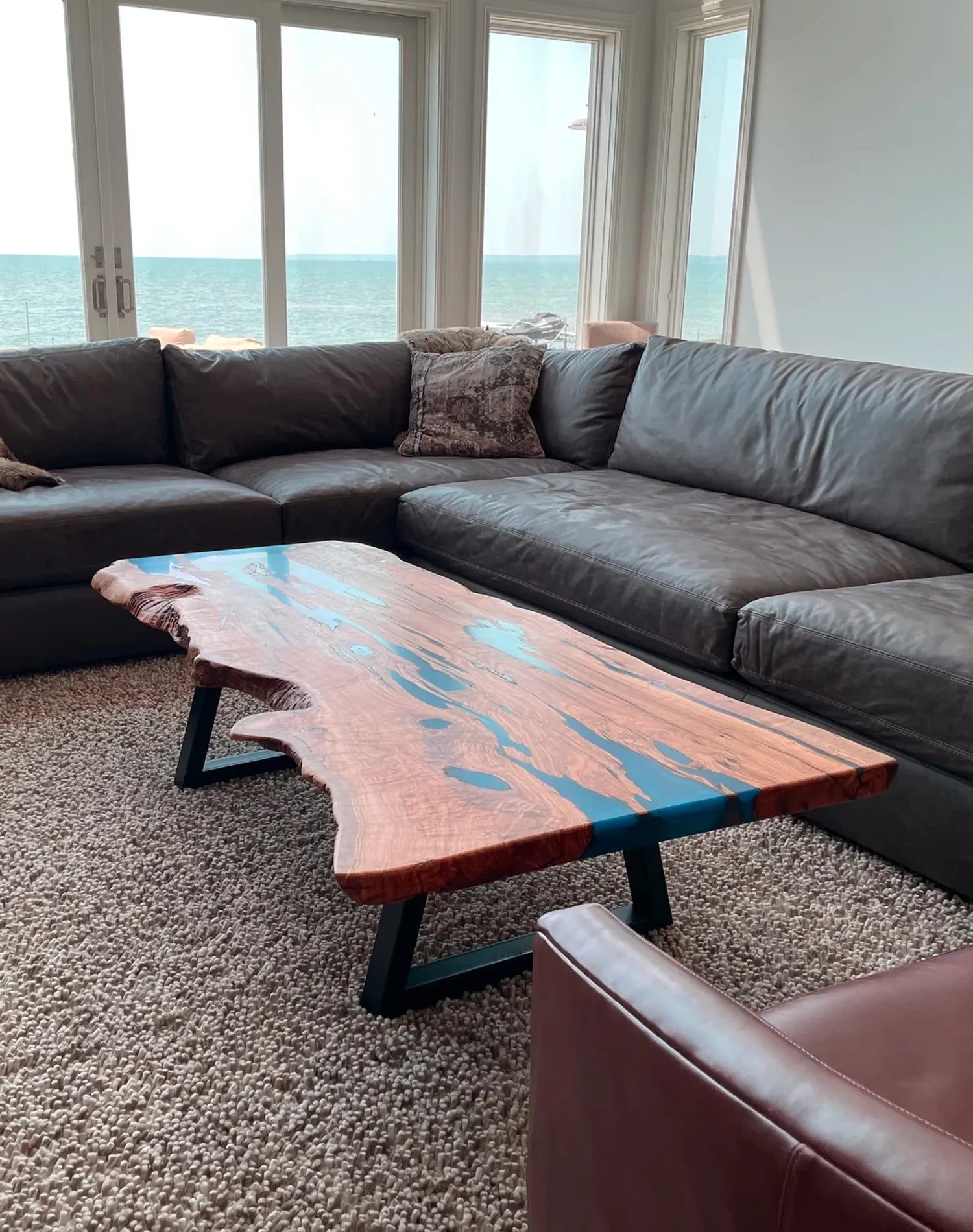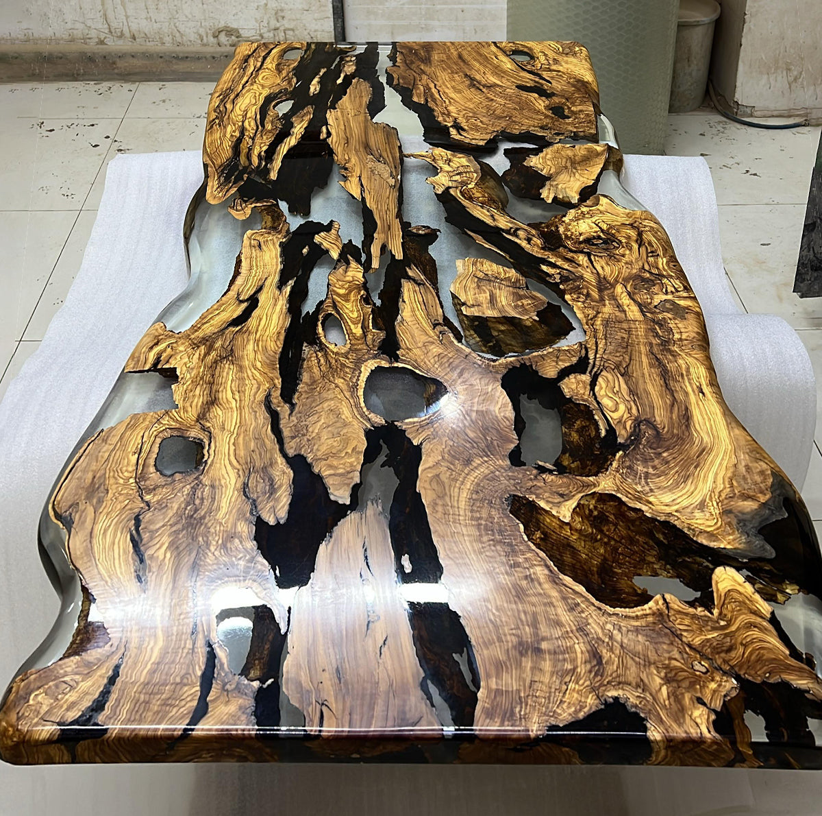 Unique river live edge custom coffee table made from olive wood and epoxy resin.